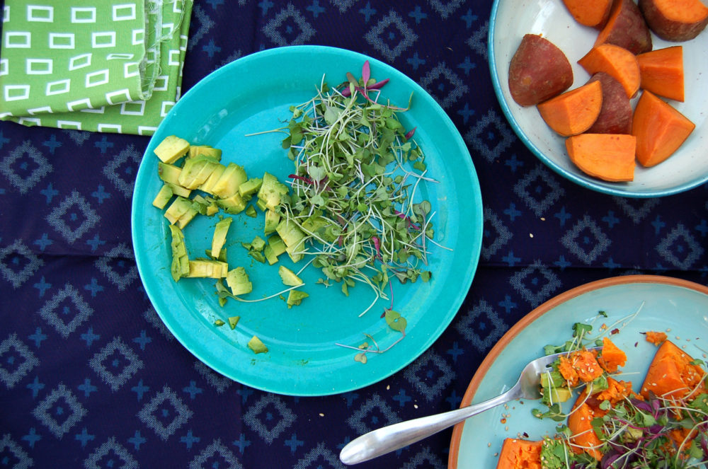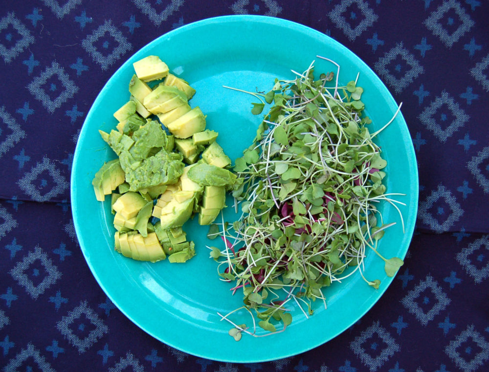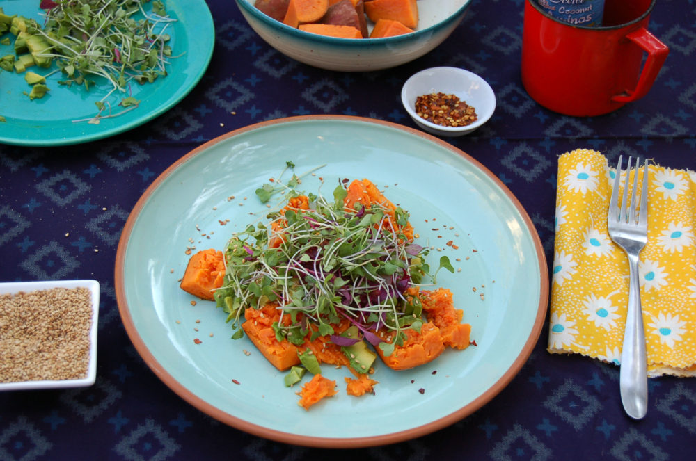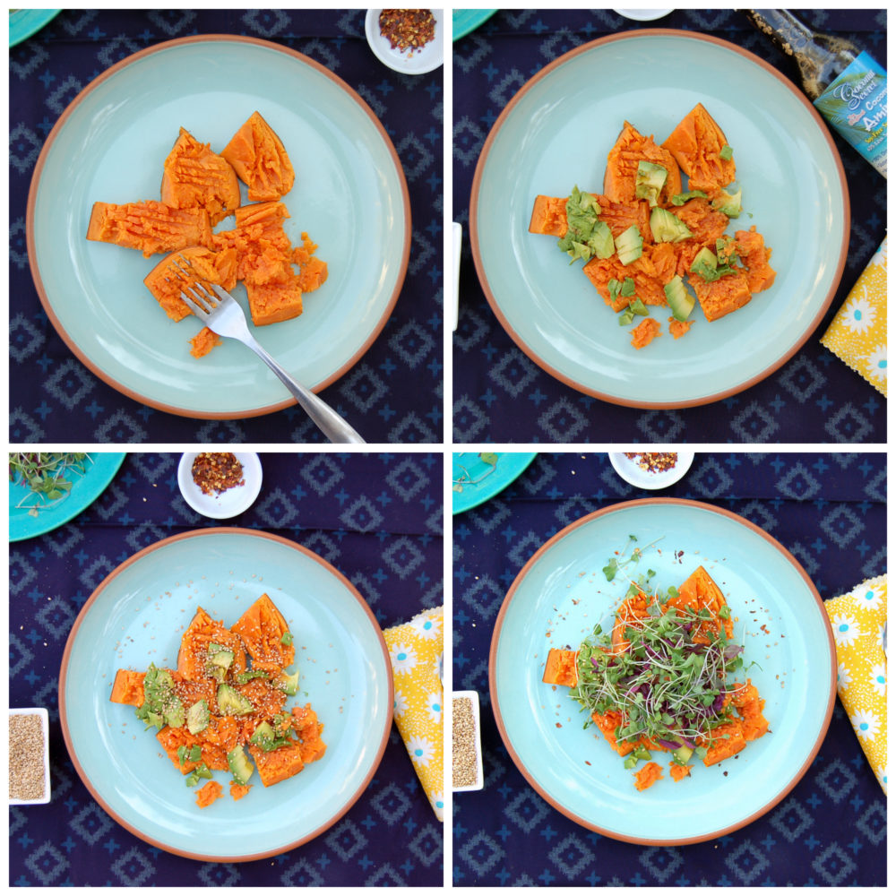 - Top with avocado, toasted sesame seeds, coconut aminos and microgreens or sprouts.