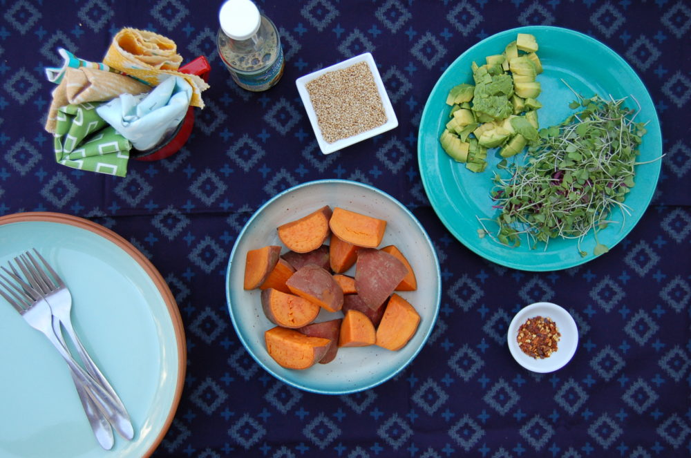 - Sweet potatoes make one per person and make a couple extra so you have an easy lunch for the next day