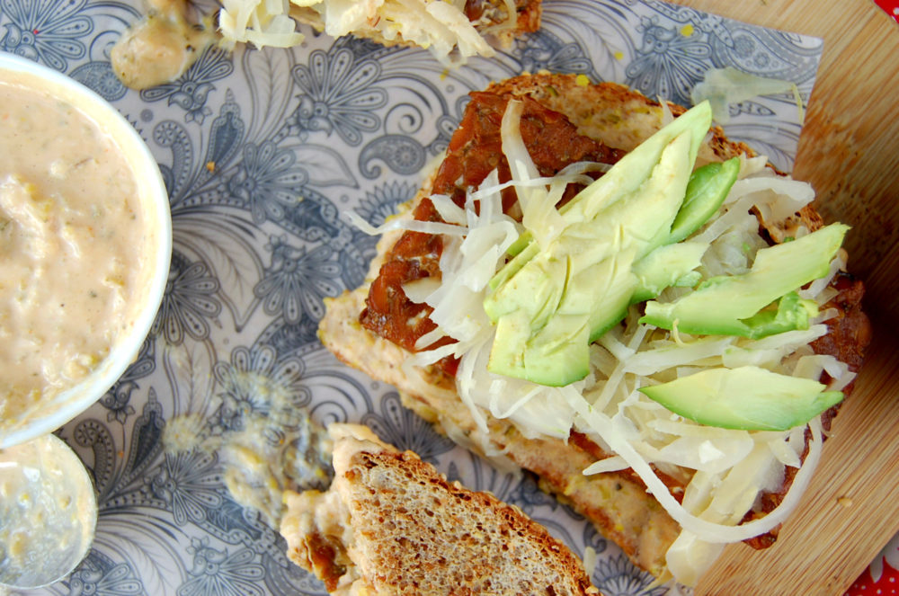 - Toast one or two pieces of sprouted grain bread, and pour the dressing over the bread.