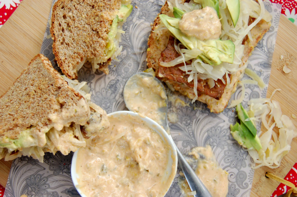 I’d been craving a Reuben and couldn’t find a recipe that quite did it for me. This one was SPOT ON! I added a dollop of Vegan Tangy White Cheese Sauce from MonkeyandMeKitchenAdventures.com for the Swiss cheese part of a traditional Reuben. Hubby asked that I PLEASE make this one again soon- and requested extra dressing for his daily salads.